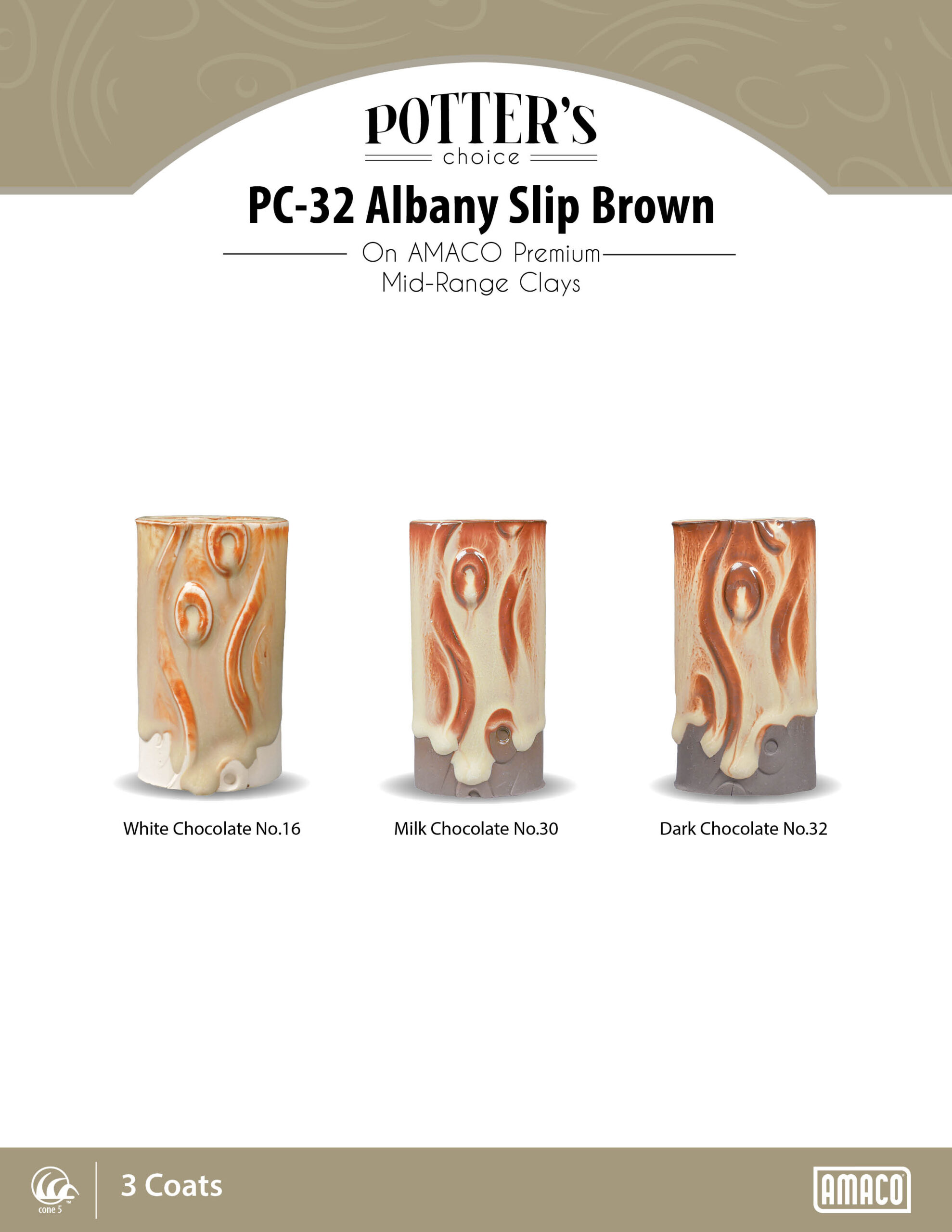 Like the traditional potter’s glaze that inspired it, Albany Slip Brown is fluid and butter colored where thick and russet where thin. Great layered over or under other Potter’s Choice glazes.