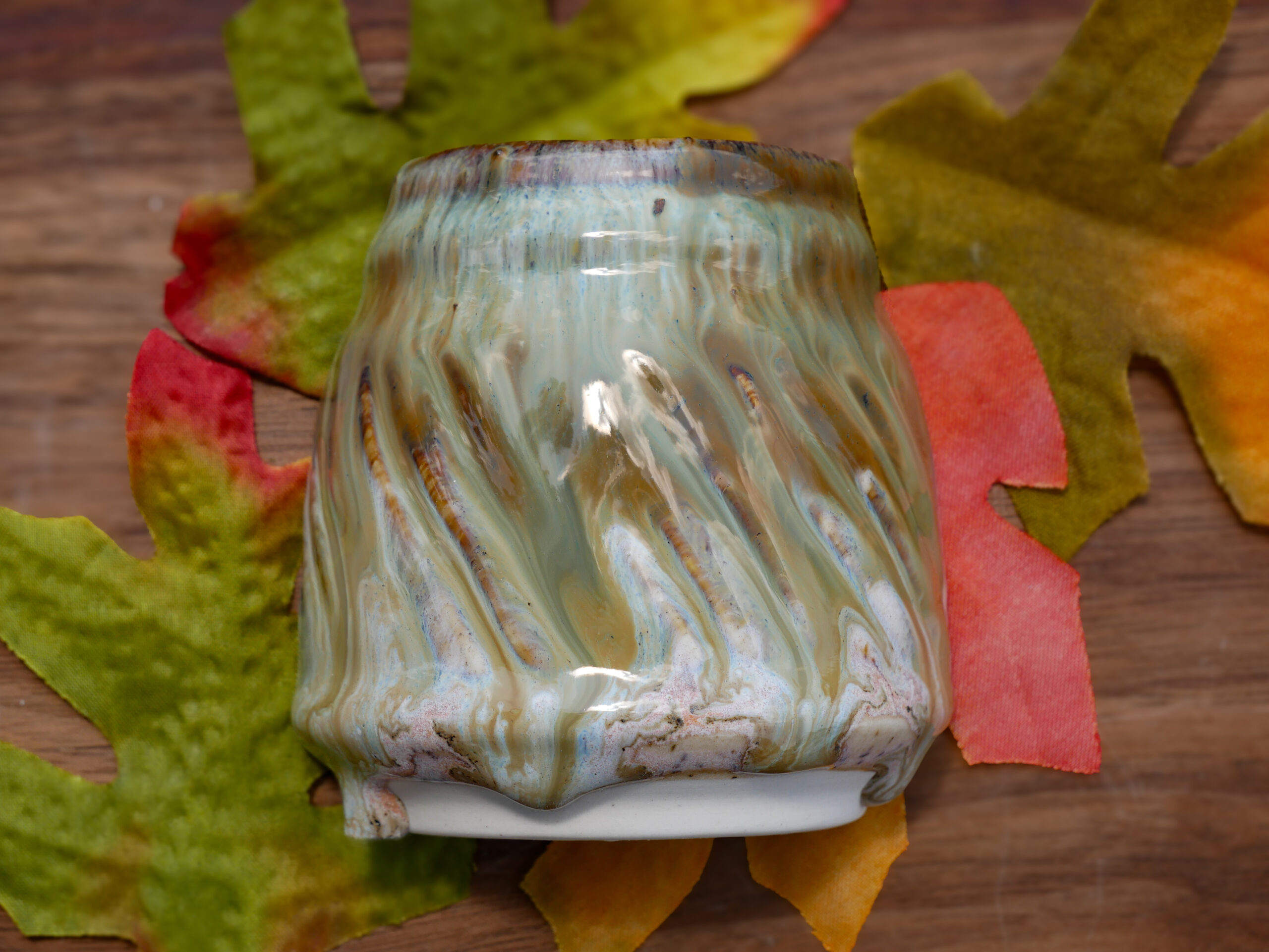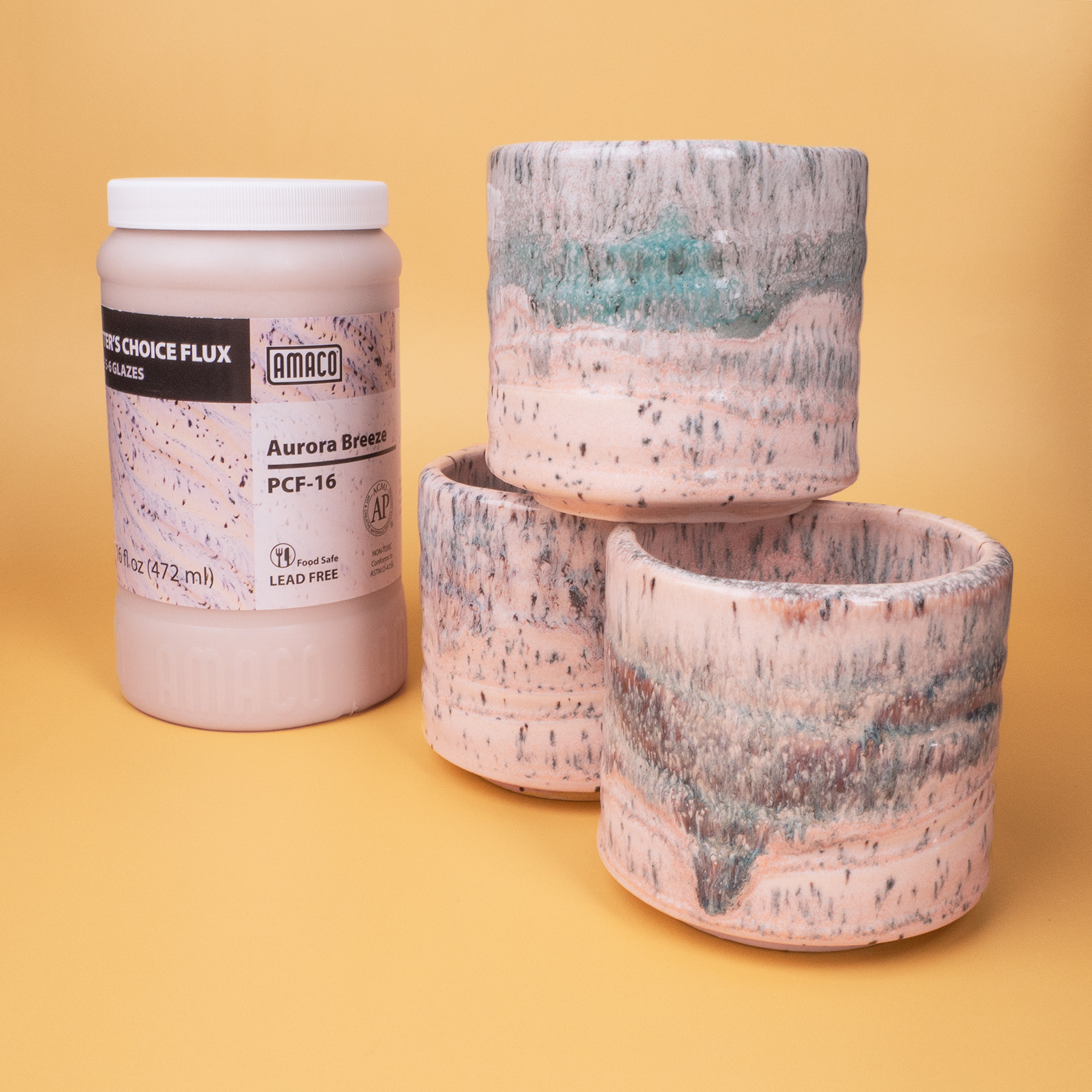 PCF-16 Aurora Breeze is a hazy pink glaze with hints of blue and purple and dark speckles. It breaks across textured surfaces, developing a warm blush float when thick. Great for layering with other glazes as a base or top coat. Beautiful on any color of clay.