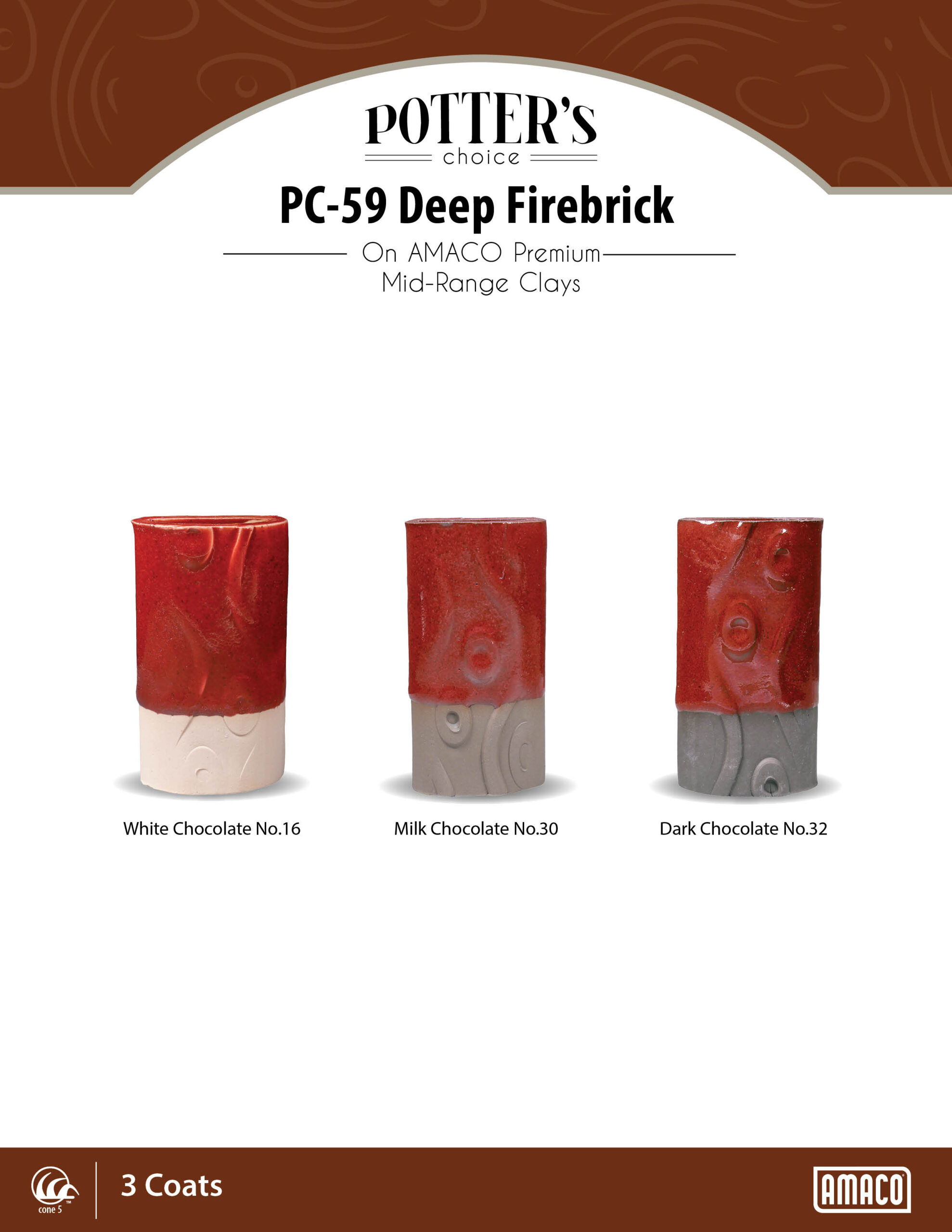 Deep Firebrick is an opaque, speckled brick red glaze that breaks translucent where thin. This bold, dark red glaze has a strong presence and layers well under or over other Potter’s Choice glazes. This glaze contains black specks that may clog spray guns. Make sure glaze is well-mixed to ensure even distribution of speckles.