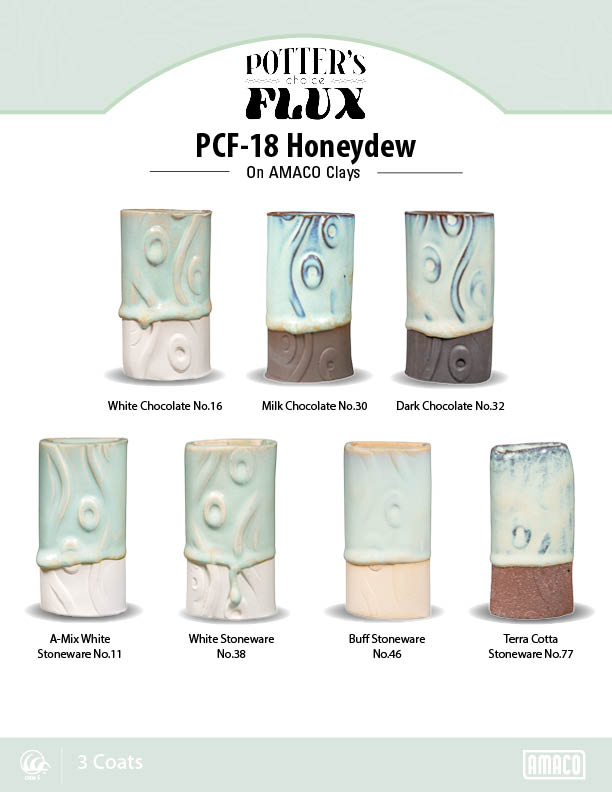 Beautiful on any color of clay. Good at cone 5, more fluid at cone 6. The green moon jar pictured is PCF-18 Honeydew over PC-01 Saturation Metallic fired at Cone 6. The blue moon jar is PCF-18 Honeydew over C-01 Obsidian.